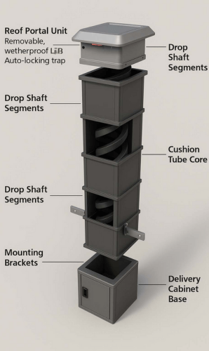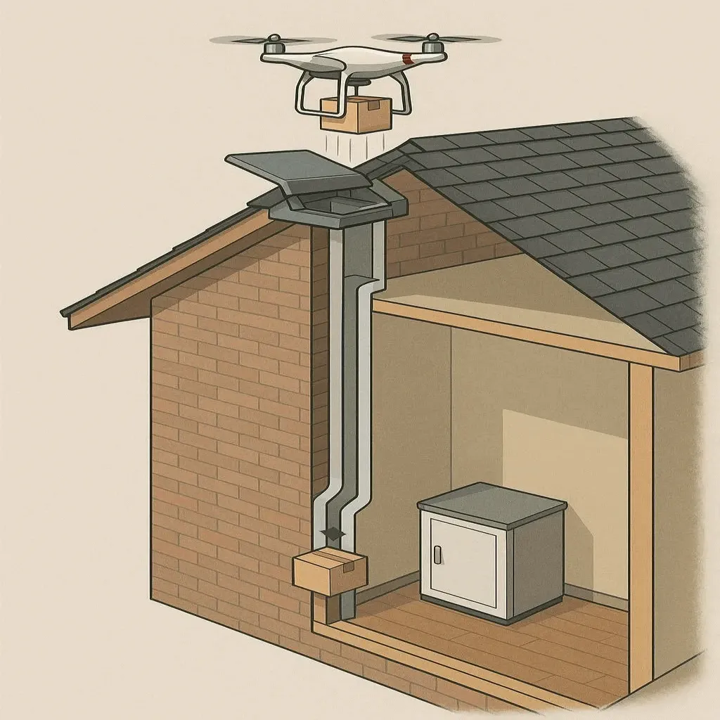 The SmartDrop Tube™ solves the “last-foot” challenge — delivering packages safely inside buildings through a modular shaft and secure indoor cabinet. Its auto-locking roof hatch, shock-absorbing inner tube, and smart delivery cabinet ensure a fully autonomous and weatherproof end-to-end system. Perfect for residential, commercial, or high-rise integration.